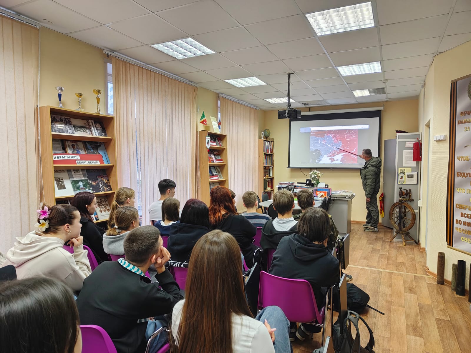 Руководитель музея Курбатова Элина Викторовна на примере межнациональной дружбы и единства воинов 354-й стрелковой дивизии разных национальностей продемонстрировала единство народа, которое всегда спасало Россию в трудные времена. На урок был приглашен участник СВО, который рассказал о необходимости воспитания чувства уважения, принятия и правильного понимания других культур.